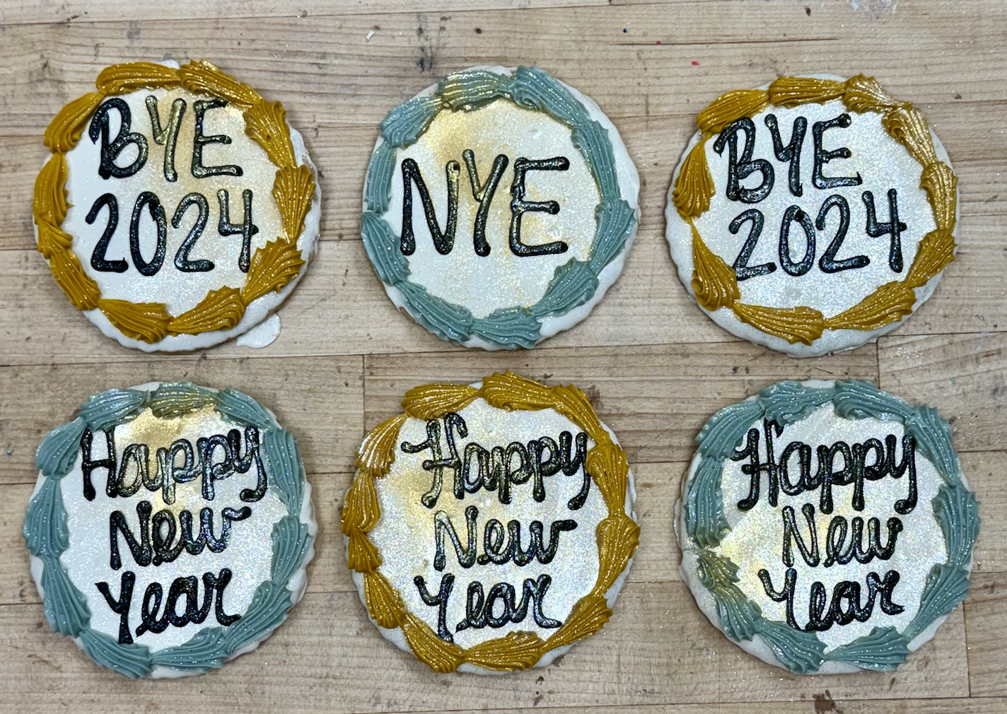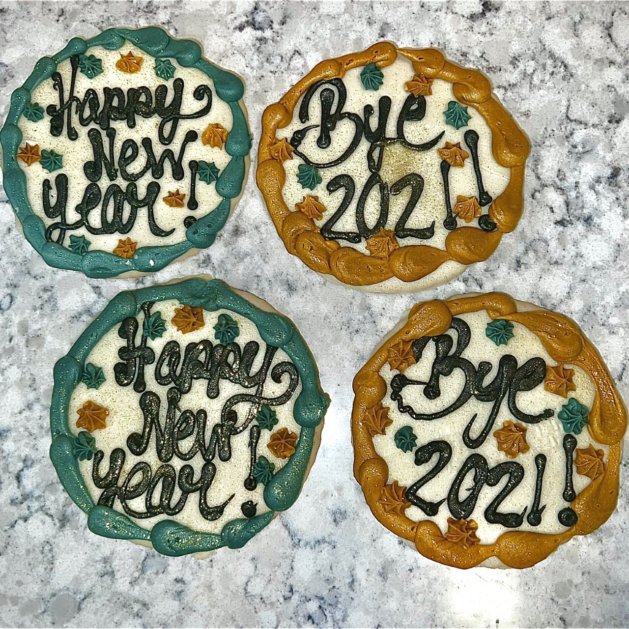 A dozen of our hand-decorated sugar cookies, decorated for the present New Year.