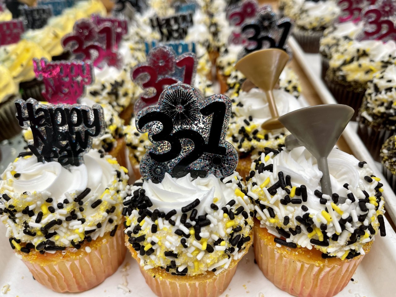 A dozen of our swirl cupcakes (mix of chocolate and yellow cake unless otherwise specified) and topped with a swirl of buttercream icing, and a festive New Year's-themed topper.