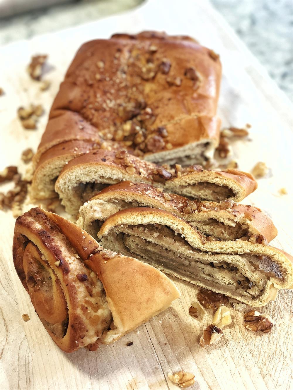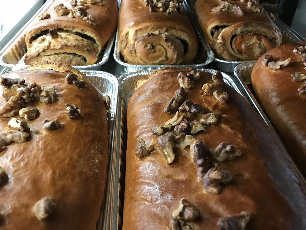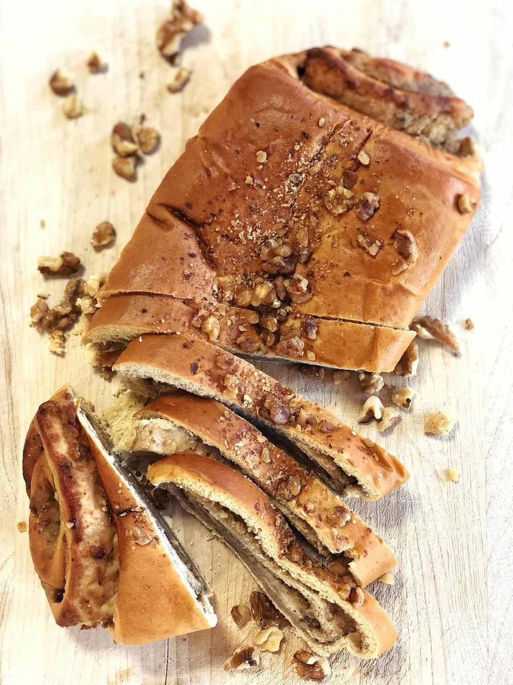 Our traditional nut roll with a thick layer of nut filling and topped with walnuts.