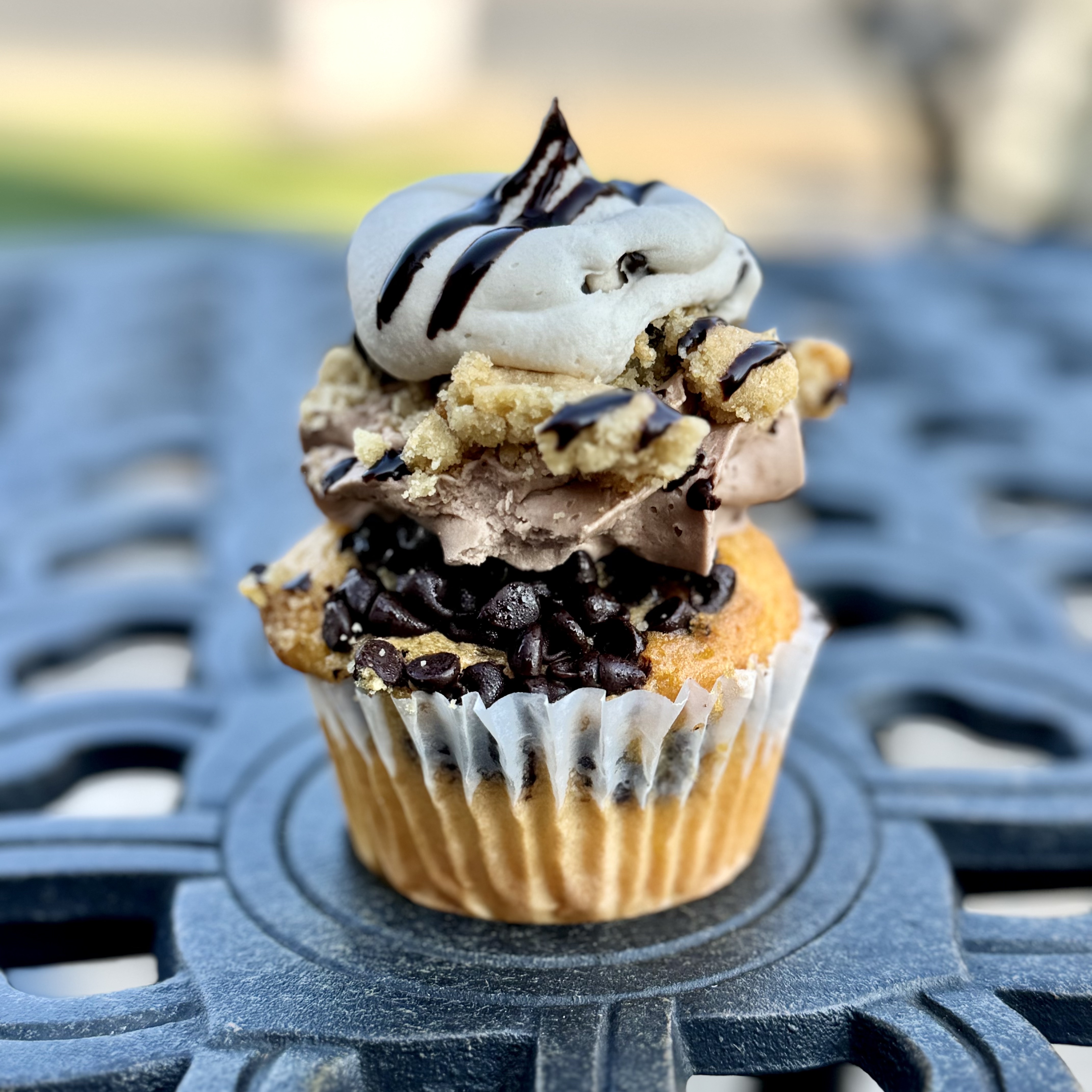 A chocolate chip cake, topped with a swirl of nutella buttercream, rolled in cookie crumbs, & then topped with a dollops of cookie dough & a drizzle of chocolate.