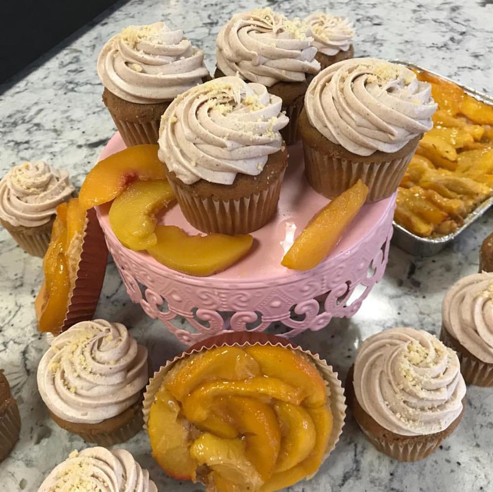 A cinnamon spice cake, filled with fresh peach filling, topped with a brown sugar cinnamon buttercream, and cobbler crumbs.