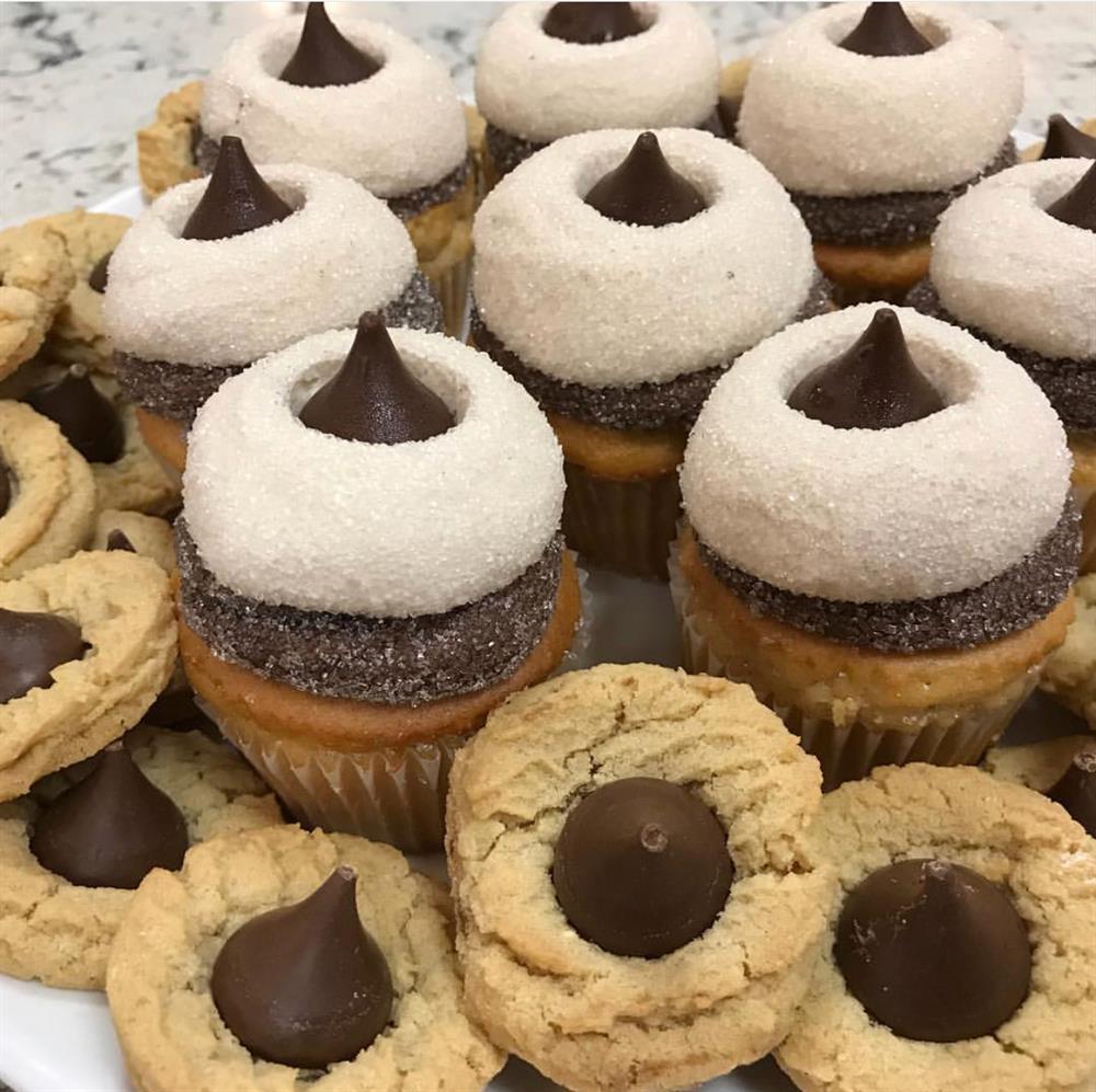 A peanut butter cake filled with chocolate fudge, and topped with chocolate fudge and peanut butter buttercream. Garnished with a Hershey kiss and finished with sparking sugar.