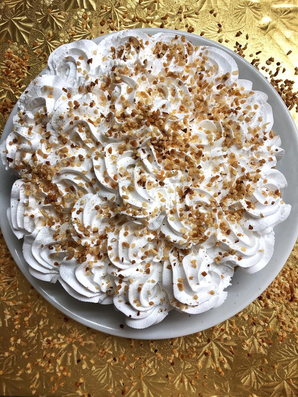 Our 10 inch (serves 8+) pie shell filled with peanut butter custard, and topped with fresh whipped cream, and chopped peanuts.