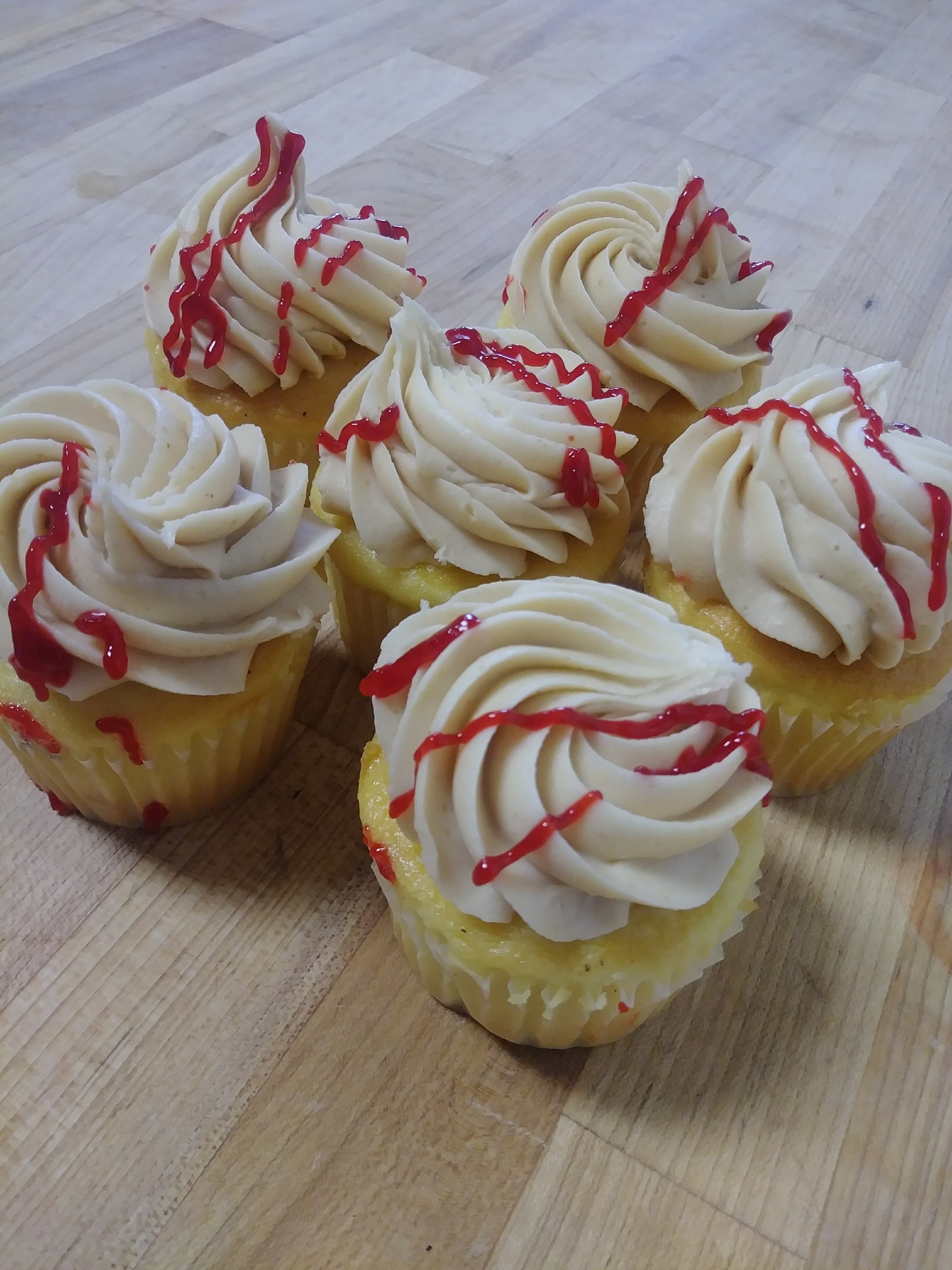 Our moist vanilla cake filled with jelly, iced with peanut butter buttercream and topped with a drizzle of jelly. One of our August Cupcakes of the Month! :)