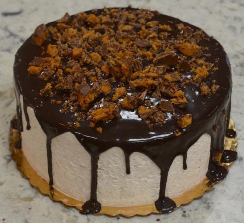 Layers of devils food cake, filled and iced with peanut butter mousse and topped with chocolate ganache and chopped Reese's peanut butter cups. Serves 6-8.
