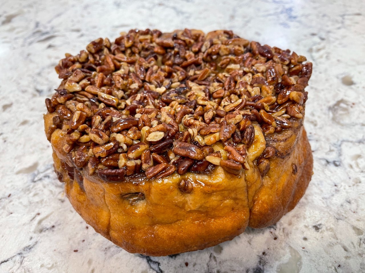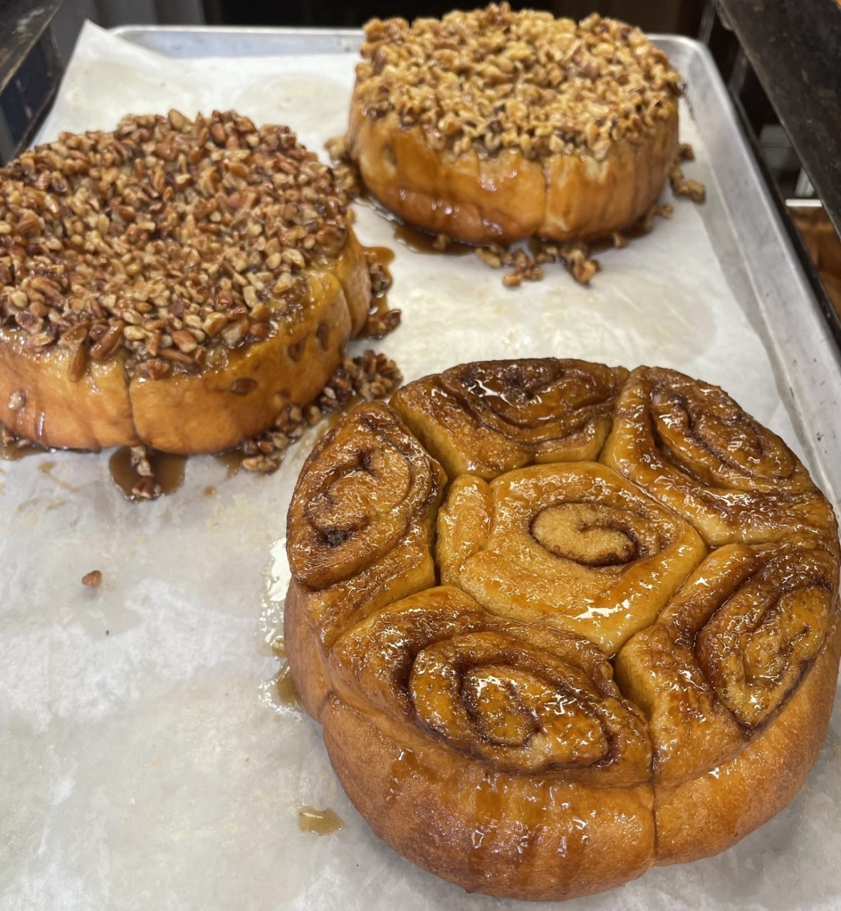 A ring of our delicious honey bun containing brown sugar and cinnamon, and coated with sticky smear and topped with chopped pecans. Contains 6 large sticky buns.