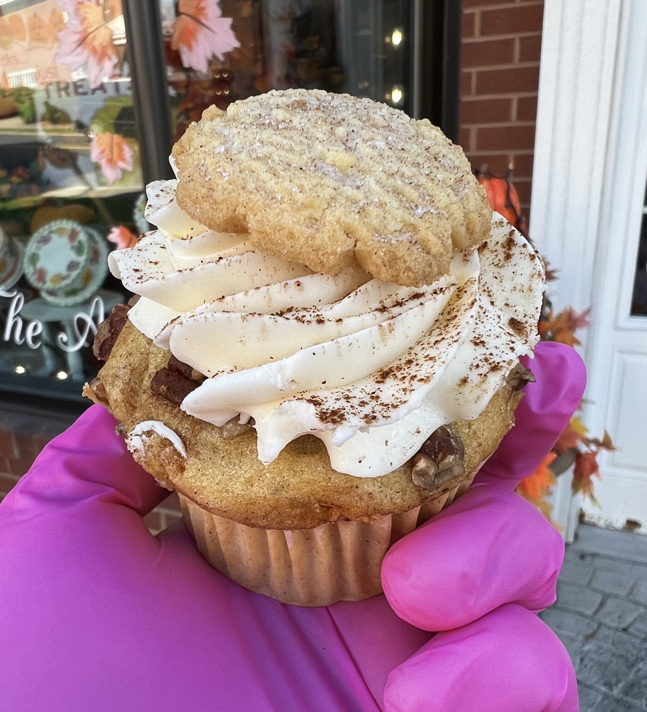 A cinnamon cupcake with pecans baked in, iced in a French Buttercream swirl, a dash of cinnamon, & topped with a mini snickerdoodle cookie & a sprinkle of candied pecans.