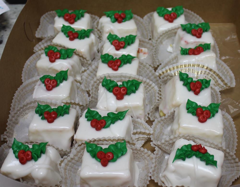 A dozen of our petit four tea cakes decorated with a hand-piped holly leaf. Each petit four is a double layer yellow cake, filled with raspberry filling, and covered in a poured vanilla glaze.