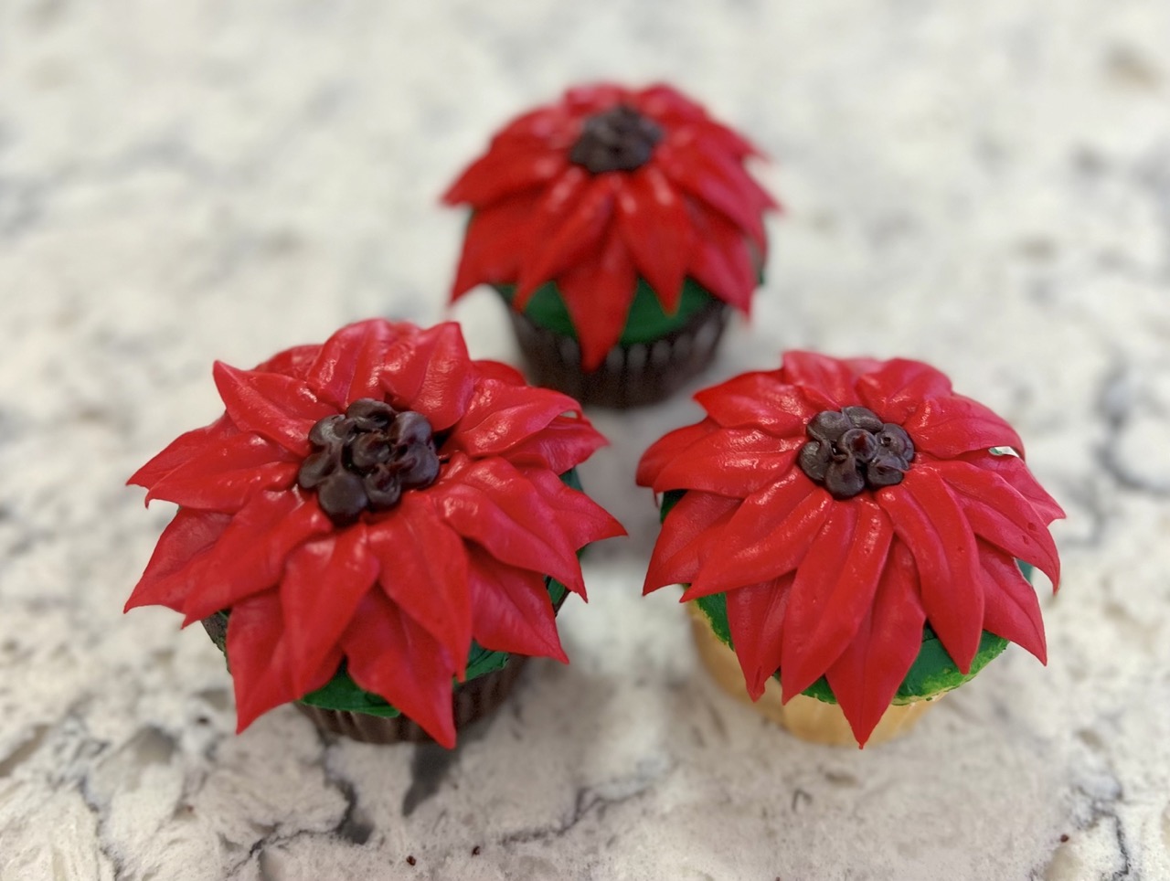 A dozen of our hand-decorated Poinsettia cupcakes (6 chocolate and 6 yellow), each decorated to look like Poinsettia (red or white petals).