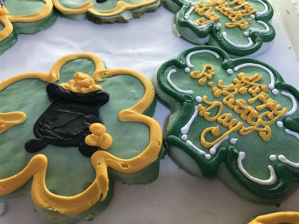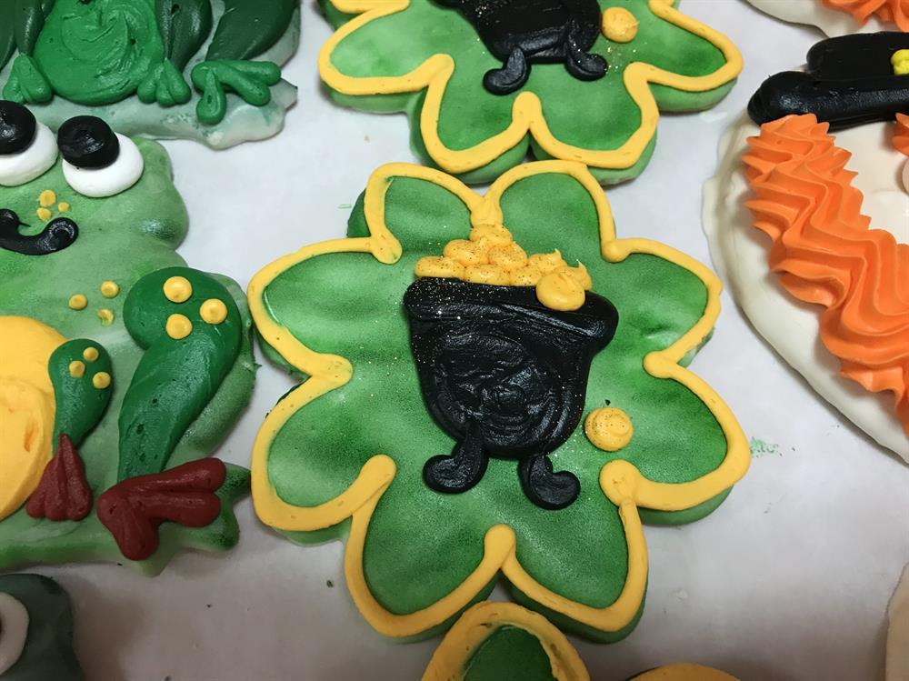 Our shamrock-shaped sugar cookie, topped with white chocolate, and hand-decorated with buttercream icing.