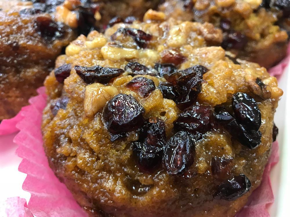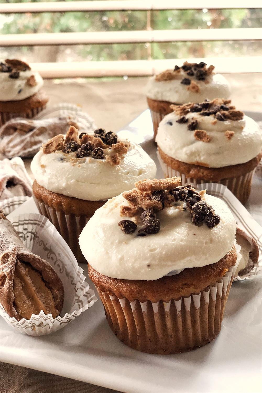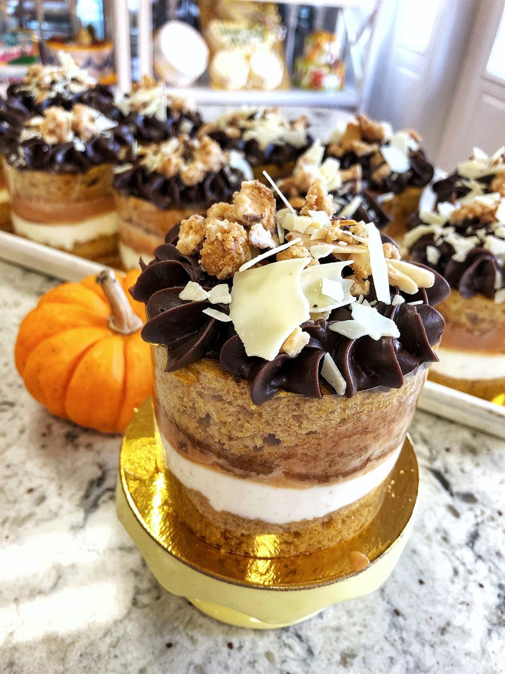 Our moist pumpkin cake topped with our real ricotta cannoli filling, and garnished with crushed cannoli shells and mini chocolate chips. To die for! :)