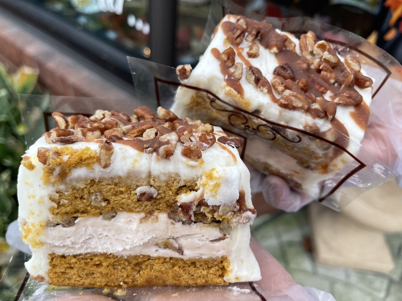 Our large size cake slice of our fall favorite- pumpkin cake with pecans mixed in, filled with caramel buttercream, and iced with our French buttercream icing- then drizzled with more caramel and chopped pecans.