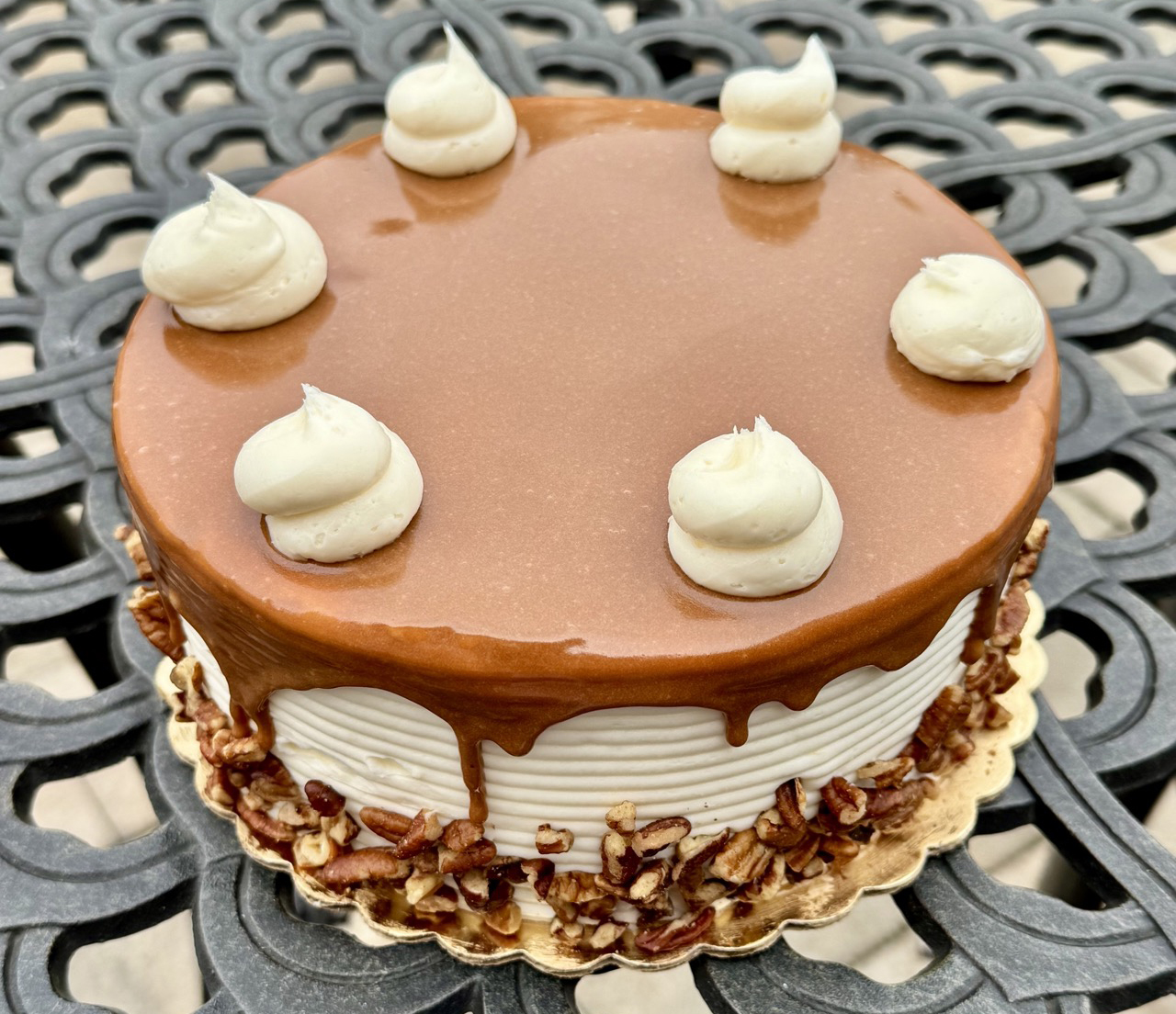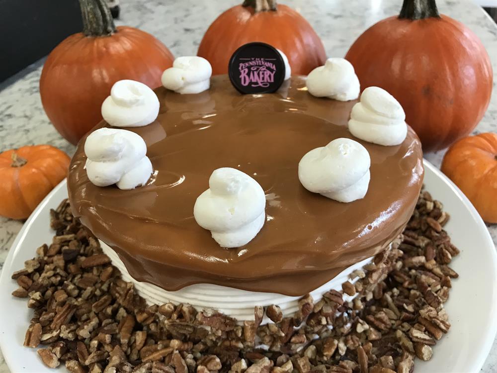 Layers of our delicious pumpkin cake with chopped pecans baked in, filled with layers of caramel buttercream, iced in French buttercream, and garnished with drizzled caramel and pecans. Serves 6 to 8.