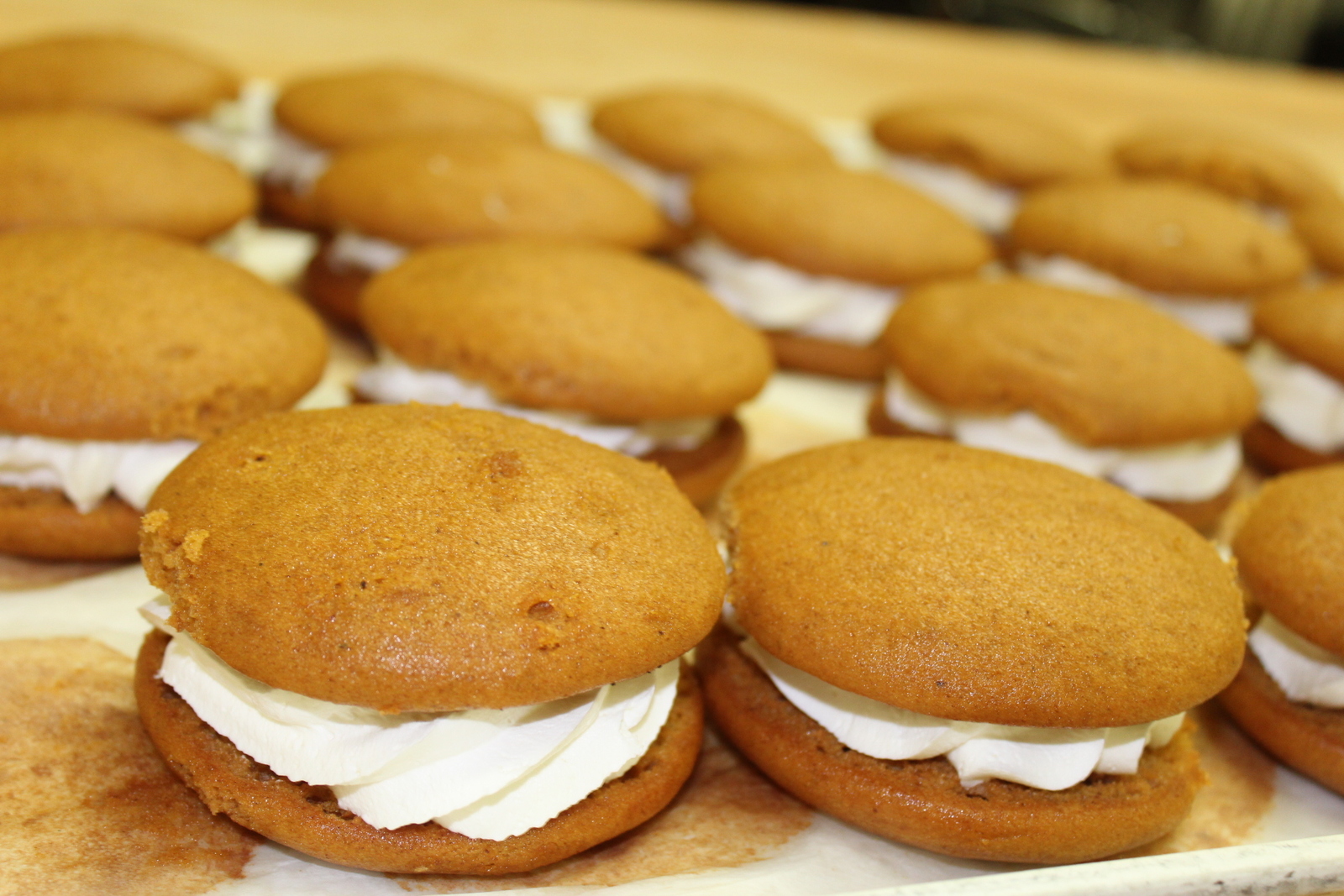 Our pumpkin individual size (around 3-4 inches in diameter) Whoopie Pie. Our delicious sandwich cookie, featuring two pieces of our moist pumpkin spice cake with a cream cheese filling.