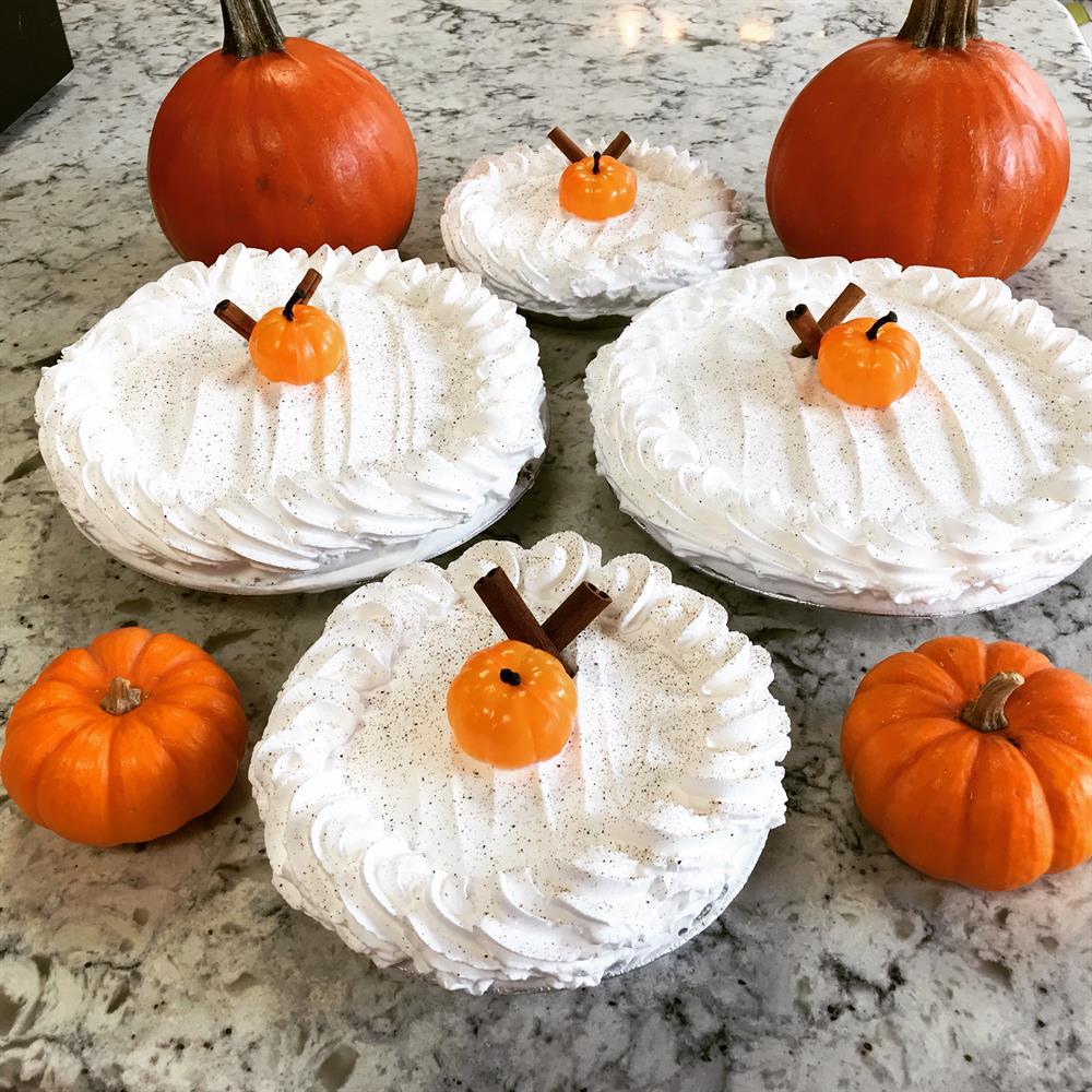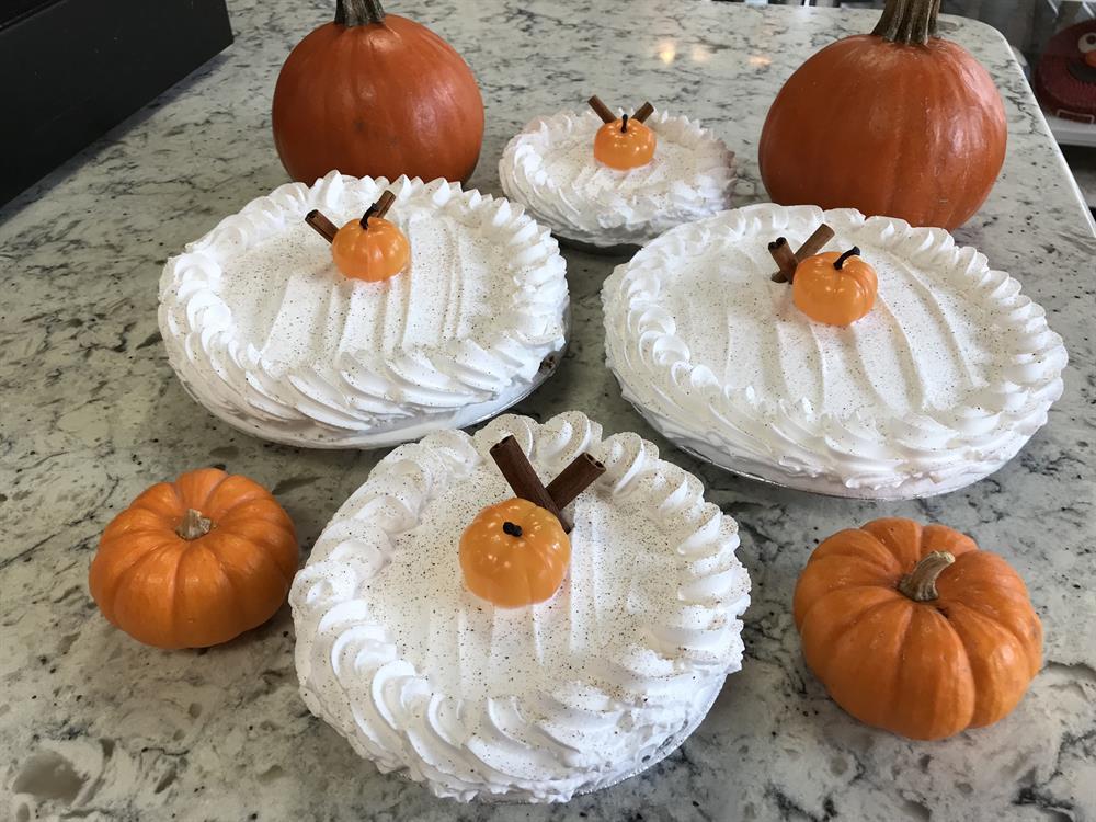 A gingersnap cookie crust, filled with pumpkin spice custard, and topped with whipped cream, and garnished with a dusting of nutmeg, cinnamon sticks, and a pumpkin. Serves 6.