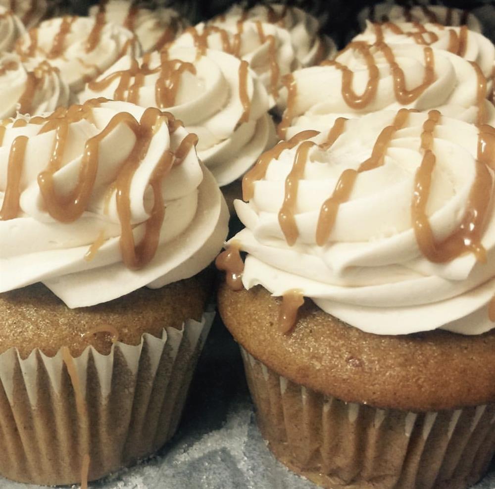 A delicious pumpkin cake topped with a salted caramel buttercream and garnished with a caramel drizzle and a dusting of sea salt.