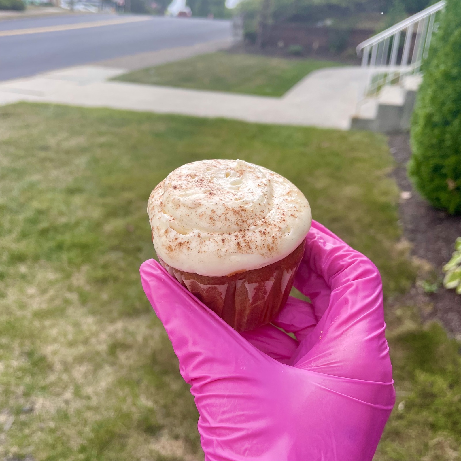 A pumpkin spice cupcake topped with a cream cheese icing and sprinkled with a dusting of cinnamon and spice.