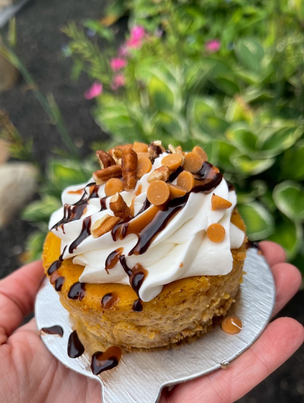 An individual pumpkin cheesecake topped with whipped cream, drizzled caramel, chocolate fudge drizzle, and chopped pecans.