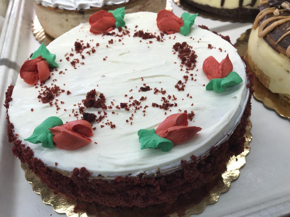 Our delicious New York style cheesecake topped with red velvet cake and cream cheese. Garnished with red velvet cake crumbs and red rose buds.