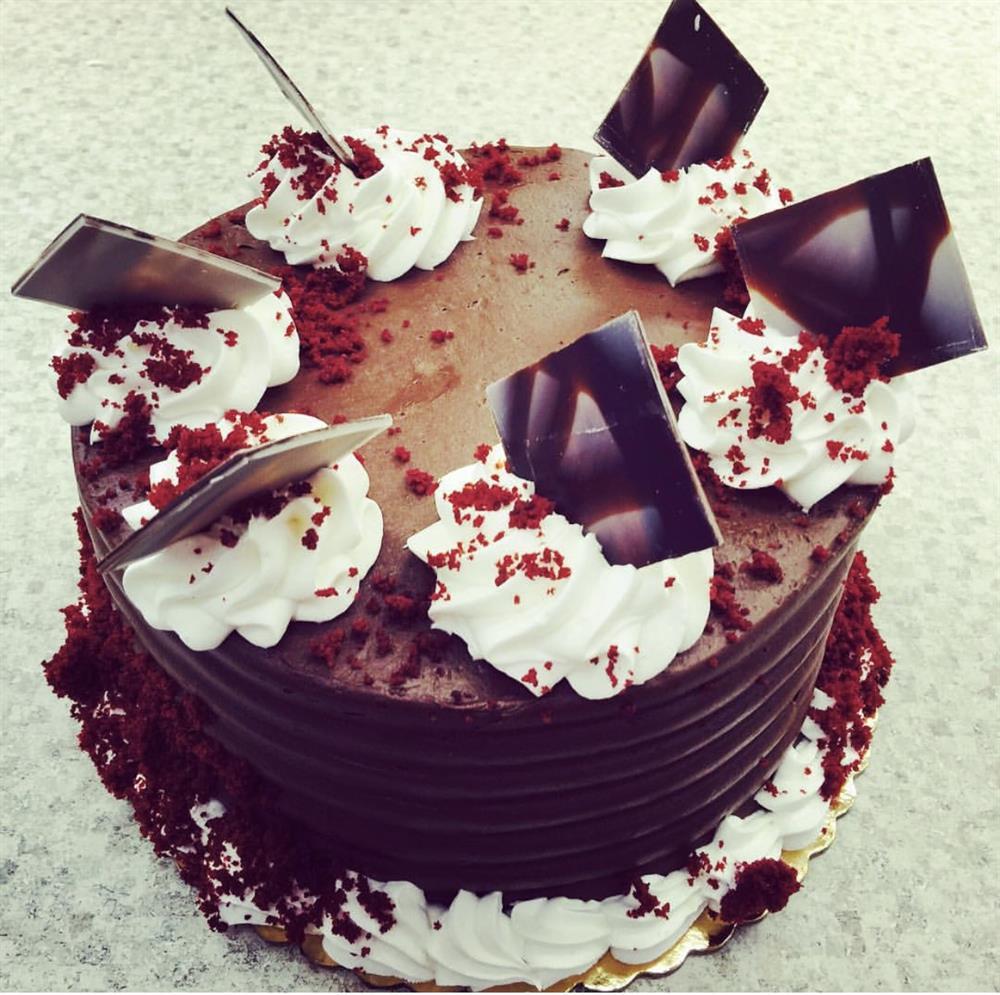 Layers of red velvet cake, filled with a thin layer of real cheesecake and cannoli filling, iced in chocolate fudge, and garnished with red velvet cake crumbs, cream cheese dollops, and chocolate pieces.