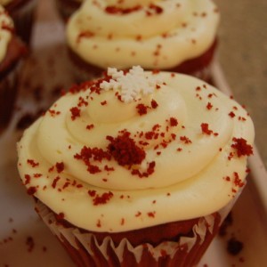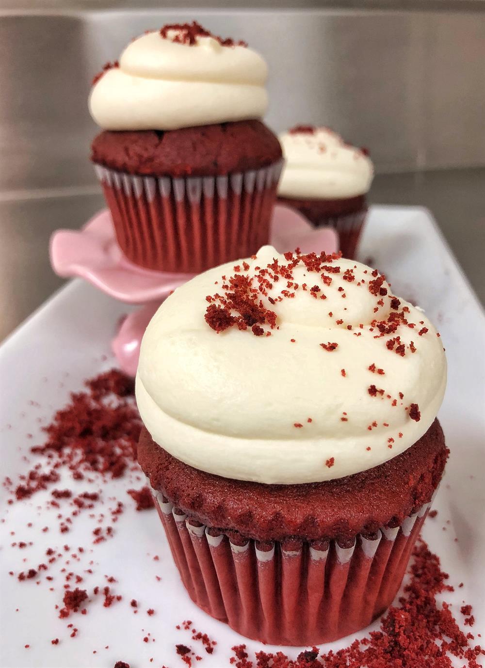 Our moist red velvet cupcake topped with a swirl of cream cheese icing.