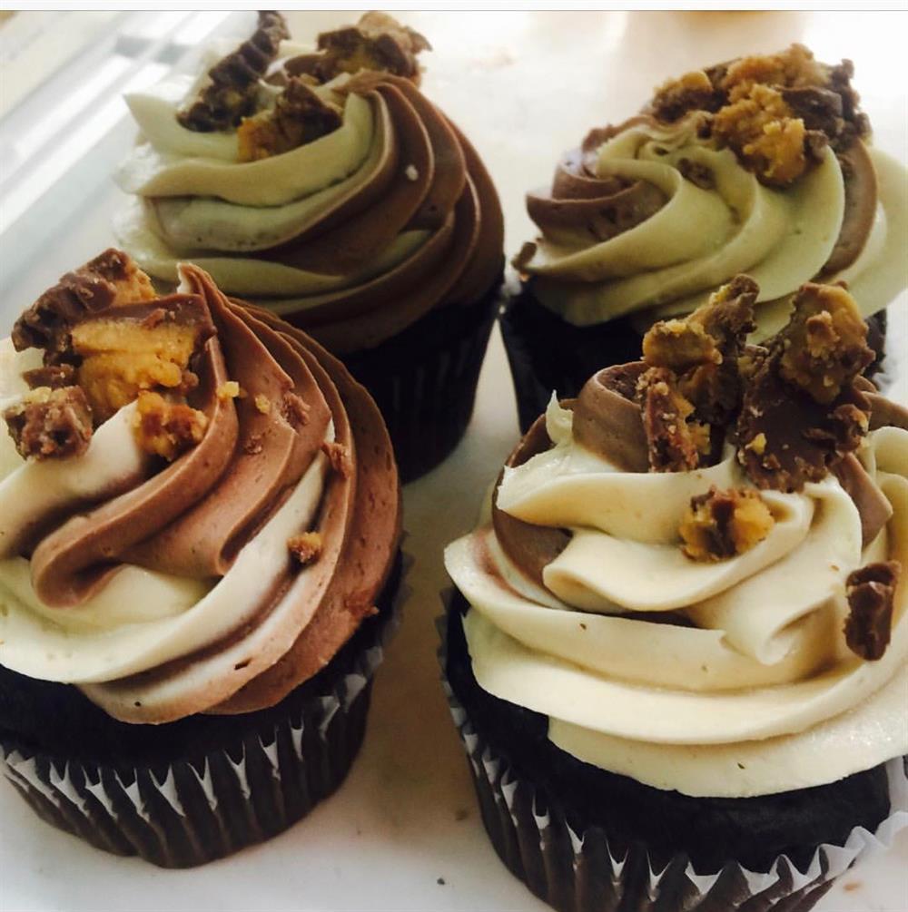A moist and rich chocolate cake topped with a chocolate peanut butter icing swirl and garnished with chocolate peanut butter cups.