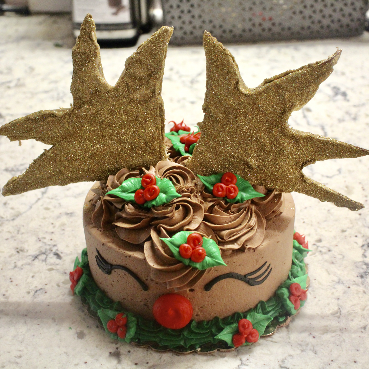 An 8 inch standard flavored cake (yellow cake, chocolate cake, marble cake, or 1/2 and 1/2 (layer of chocolate and layer of yellow)) and filled and iced with chocolate buttercream. Decorated to look like a reindeer with cardboard antlers and ears. Serves 8-10.