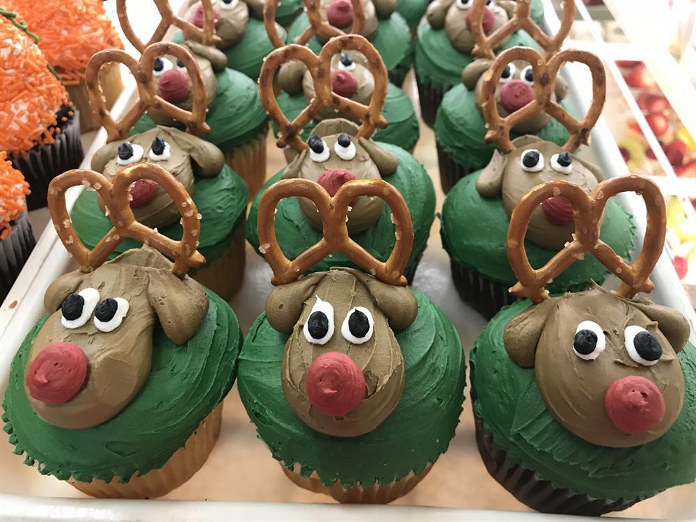 A half dozen of our hand-decorated reindeer cupcakes (3 chocolate and 3 yellow), each decorated to look like reindeer.