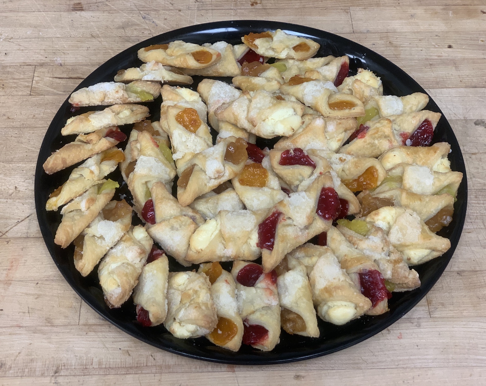 An assortment of 4 dozen of our fresh baked Rugelach pastries, all served on a catering tray. A heavenly cream cheese pastry, filled with a variety of fruit & cream cheese fillings, & finished off with a sugar crunch. Perfect bite-size little treats for any gathering.