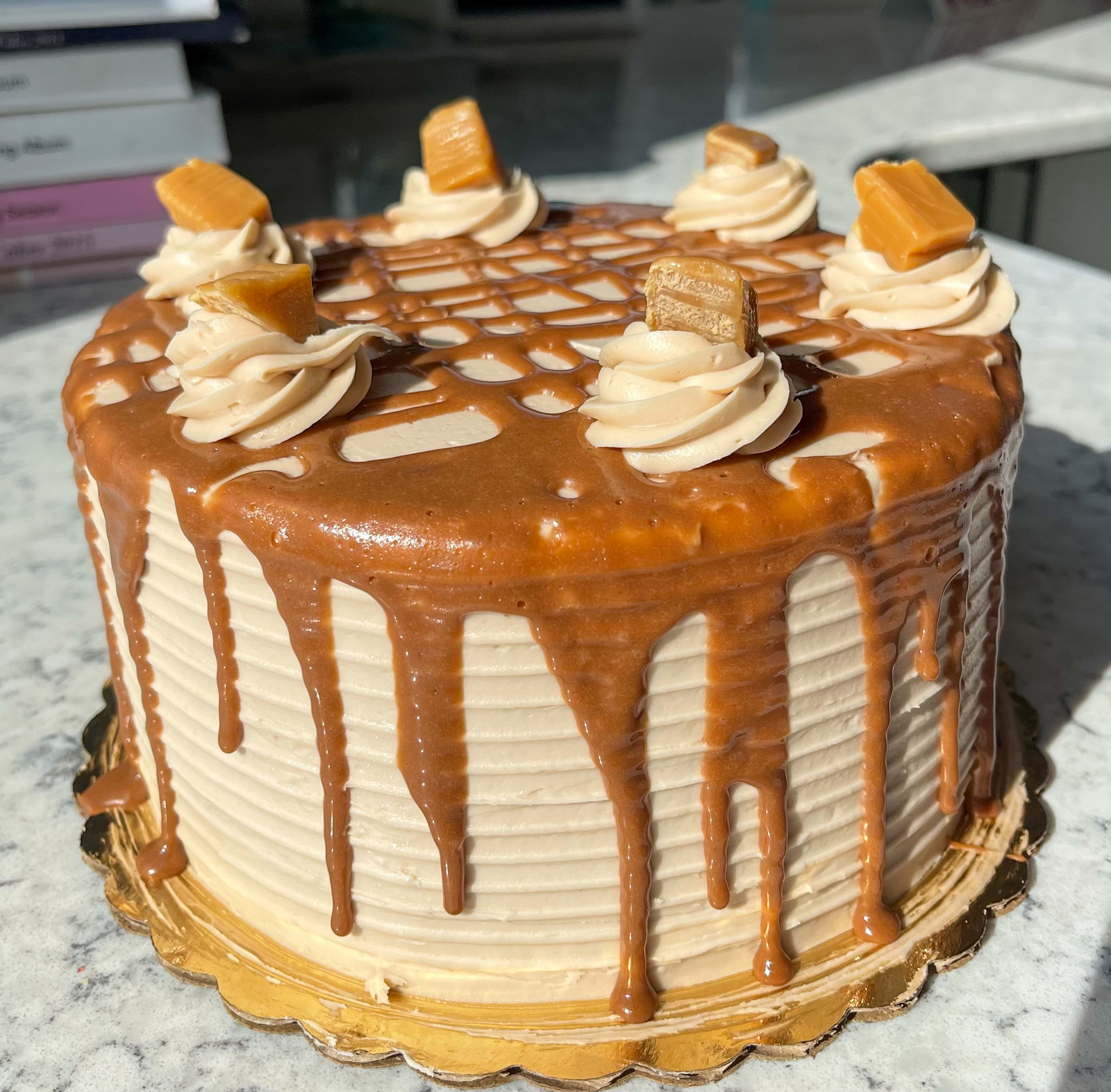 Layers of our yellow cake, filled & iced with our salted caramel buttercream, & finished off with a caramel drizzle, & a dusting of sea salt. This is a 7 inch, which serves 6-8 & is September's featured flavor of the month.