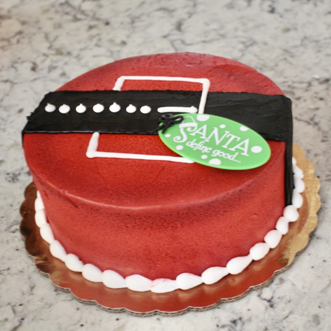 A 7 inch cake (standard flavors available: yellow, chocolate, marble, or 1/2 and 1/2 (layer of each)), iced in buttercream and decorated with a hand-piped Santa belt. Please indicate cake flavor when ordering. Serves 6-8.