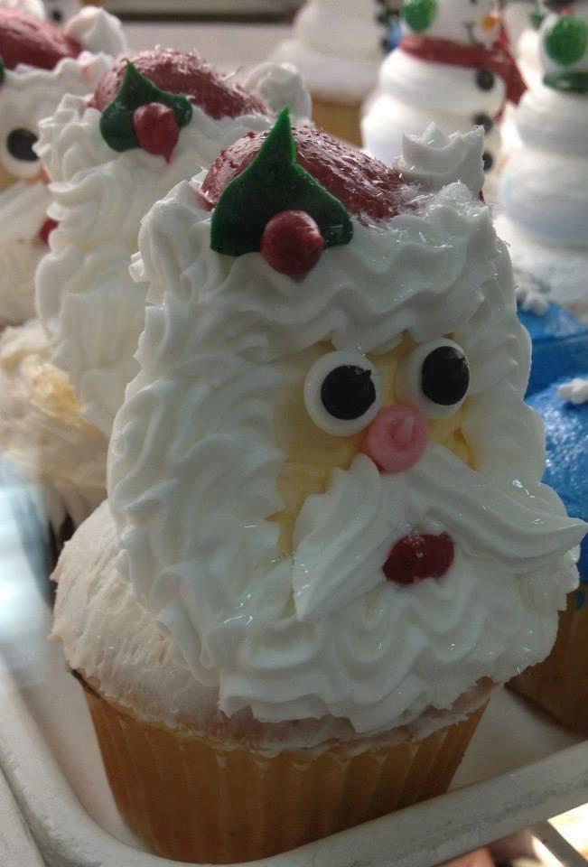 A dozen of our hand-decorated Santa cupcakes (6 chocolate and 6 yellow), each decorated to look like santas.