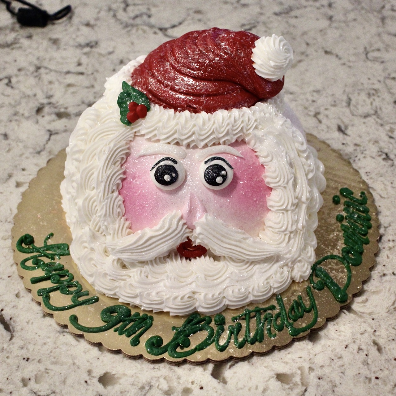 An 8 inch cake hand-shaped (standard flavors available: yellow, chocolate, marble, or 1/2 and 1/2 (layer of each)), iced in buttercream and decorated to look like a Santa Face. Please indicate cake flavor when ordering. Serves 8-10+.