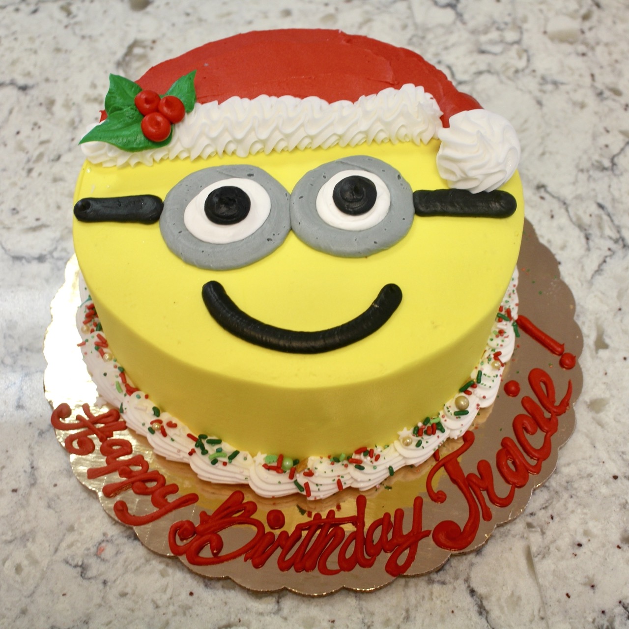 An 8 inch cake (standard flavors available: yellow, chocolate, marble, or 1/2 and 1/2 (layer of each)), iced in buttercream and decorated to look like a minion Santa face. Please indicate cake flavor when ordering. Serves 8-10.