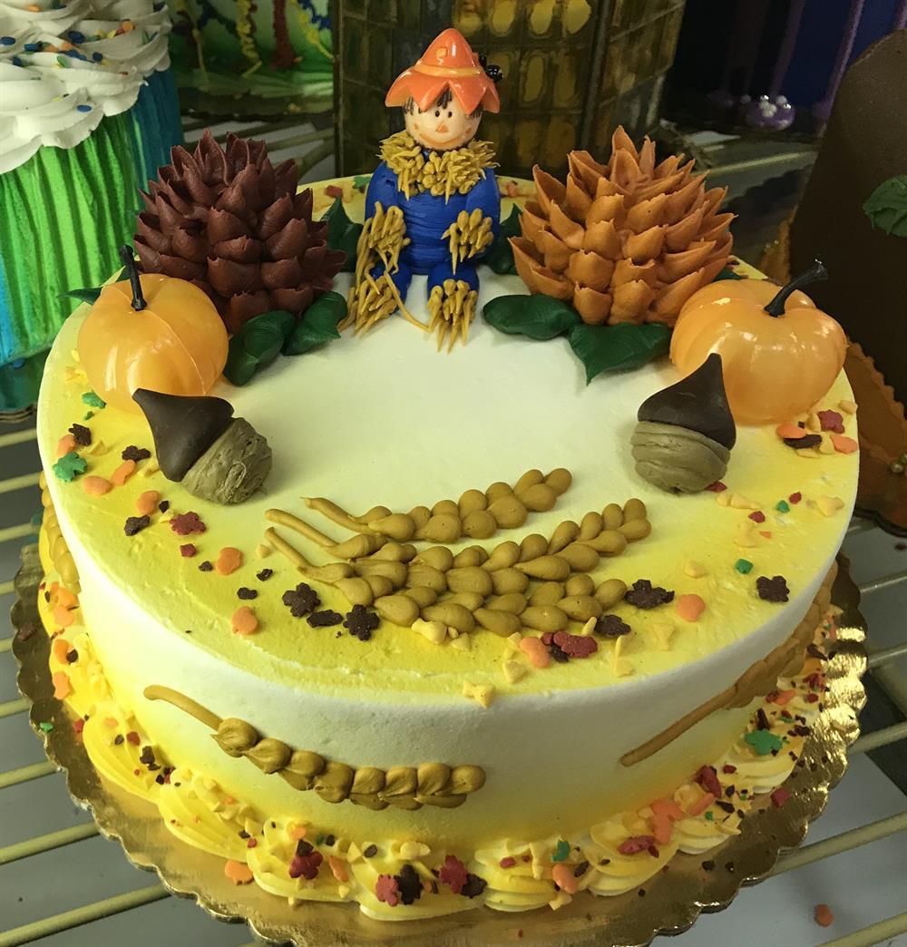 A 7 inch cake, buttercream filled, and decorated with hand-piped giant scarecrow, acorns, and other Fall decorations. Serves 6-8. When ordering, please specify cake flavor - including: yellow, chocolate, 1/2 and 1/2 (layer of yellow and layer of chocolate), or Marble.