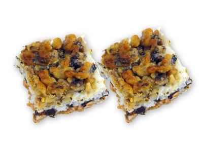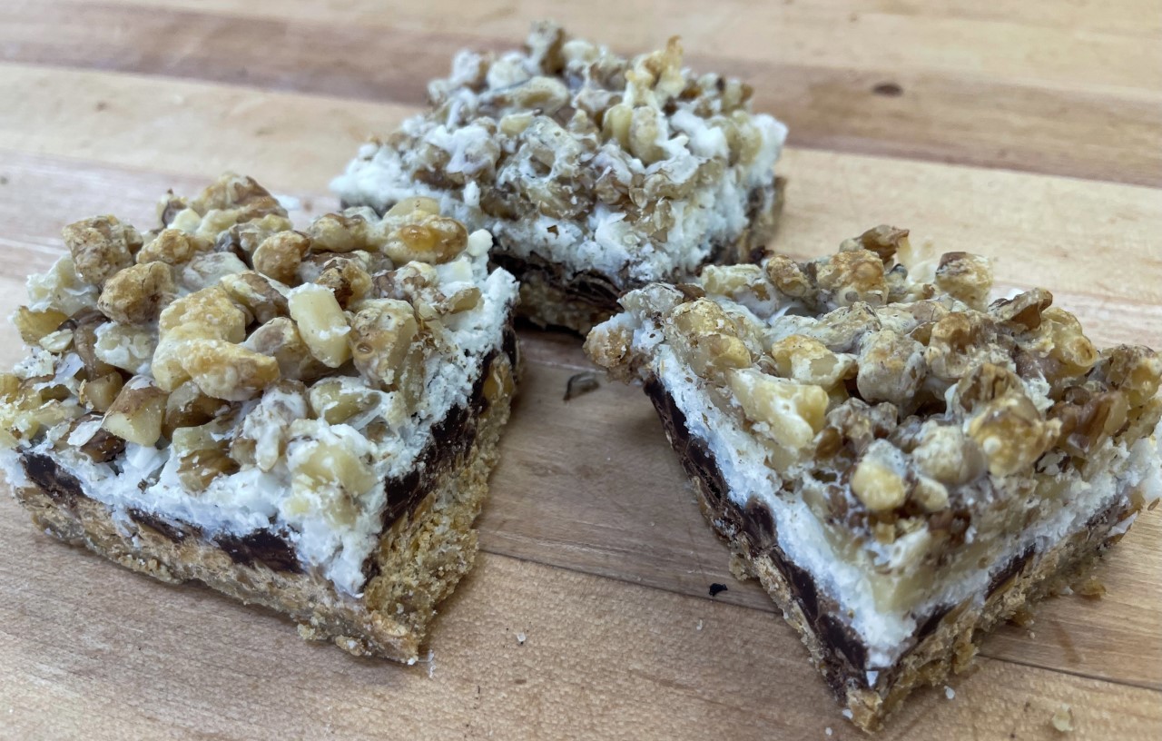 Thick chewy bars with a graham cracker crumb base and topped with nuts, chocolate chips, and coconut.