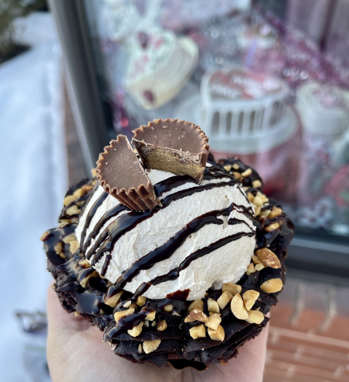 A thick layer of chocolate brownie, topped with a peanut butter mousse, chocolate fudge, a sprinkling of chocolate ganache, chopped peanuts, & a peanut butter cup.