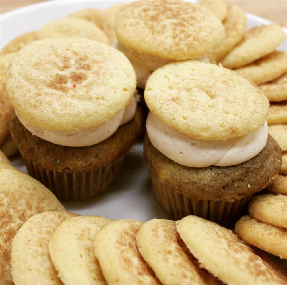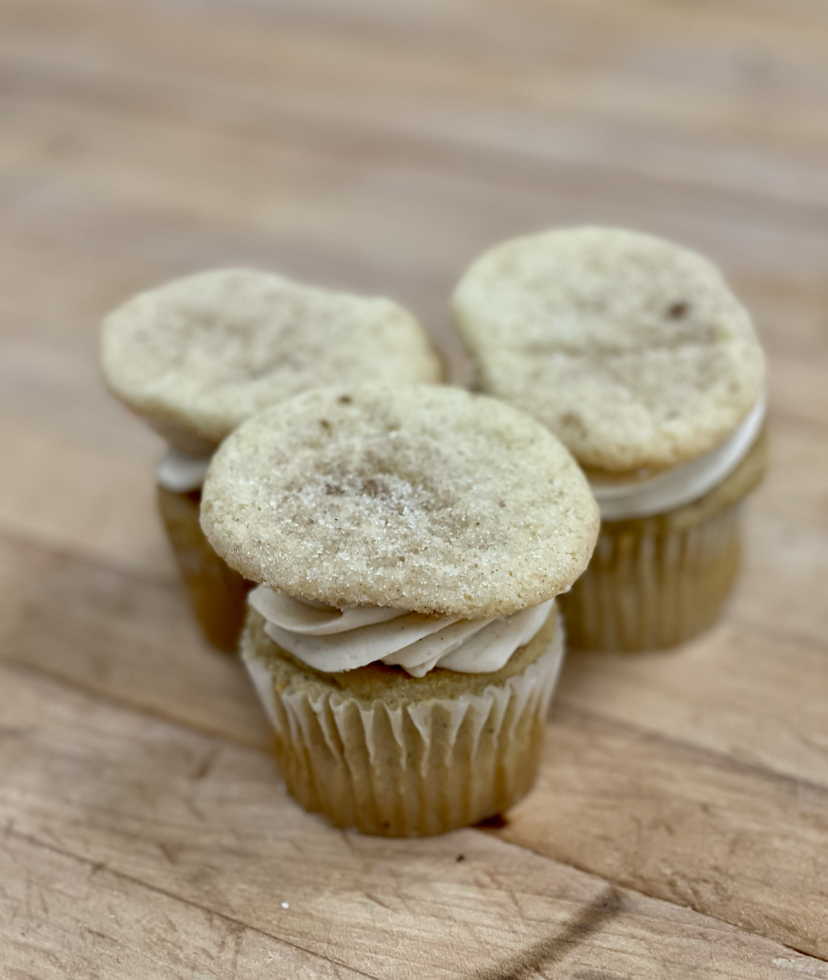 Our yummy spice cake topped with a cinnamon cream cheese, and finished off with a real snickerdoodle cookie.