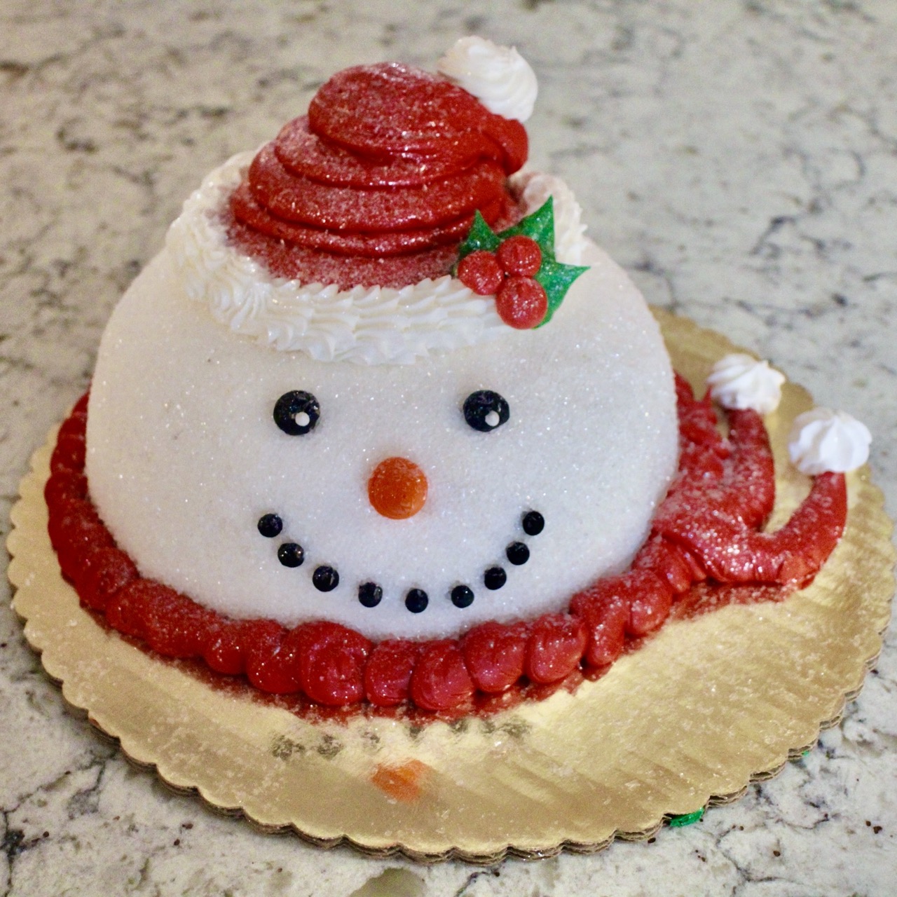 An 8 inch dome-shaped cake (standard flavors available: yellow, chocolate, marble, or 1/2 and 1/2 (layer of each)), iced in buttercream and decorated to look like a snowman head. Please indicate cake flavor when ordering.