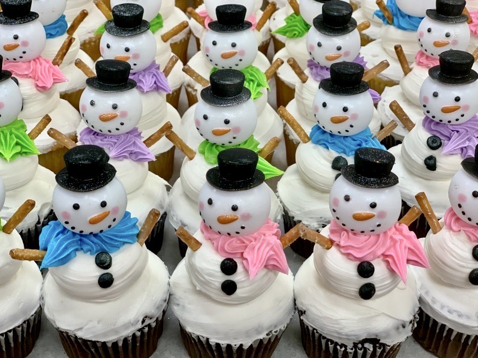 A half dozen of our hand-decorated Snowmen cupcakes (3 chocolate and 3 yellow), each decorated to look like Snowmen.