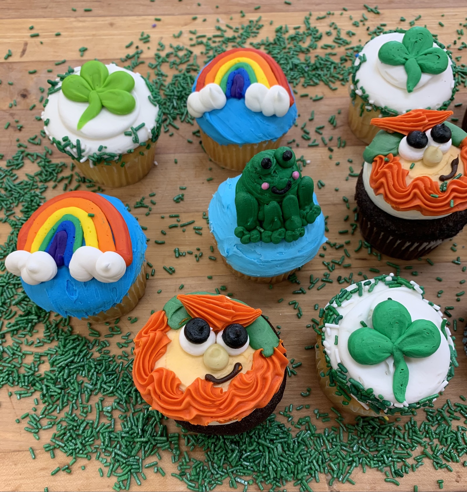 1 dozen of our St. Patty's Day Assorted Decorated Cupcakes. Available in chocolate or vanilla cake.
