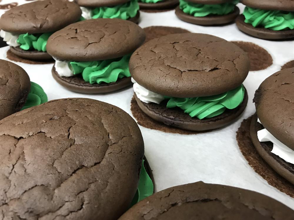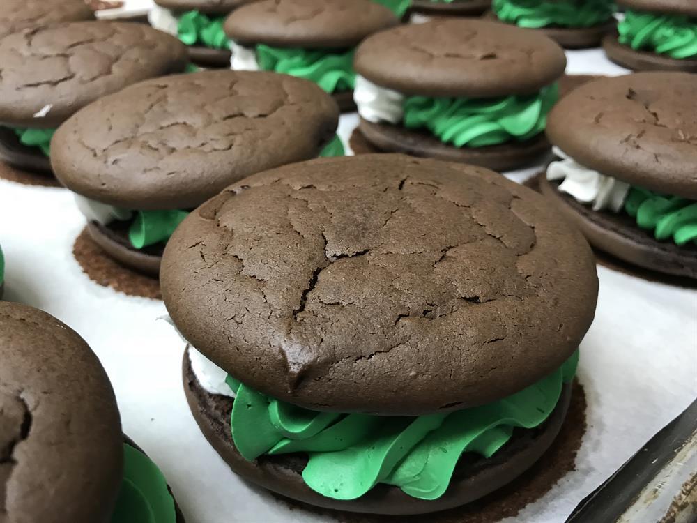 Our standard large whoopie pies filled with green buttercream for St. Patty's Day.