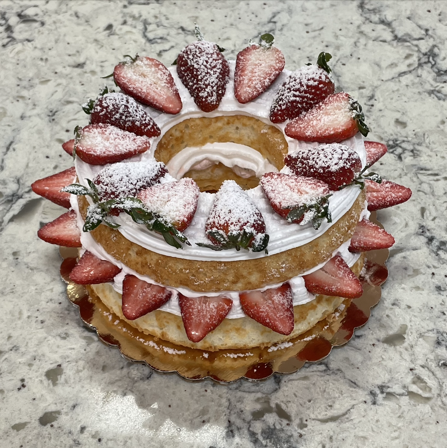 Our light and airy angel food bundt filled with whipped cream and fresh strawberries. Garnished with whipped cream, strawberries, and dusted with powdered sugar. Serves 6-8.