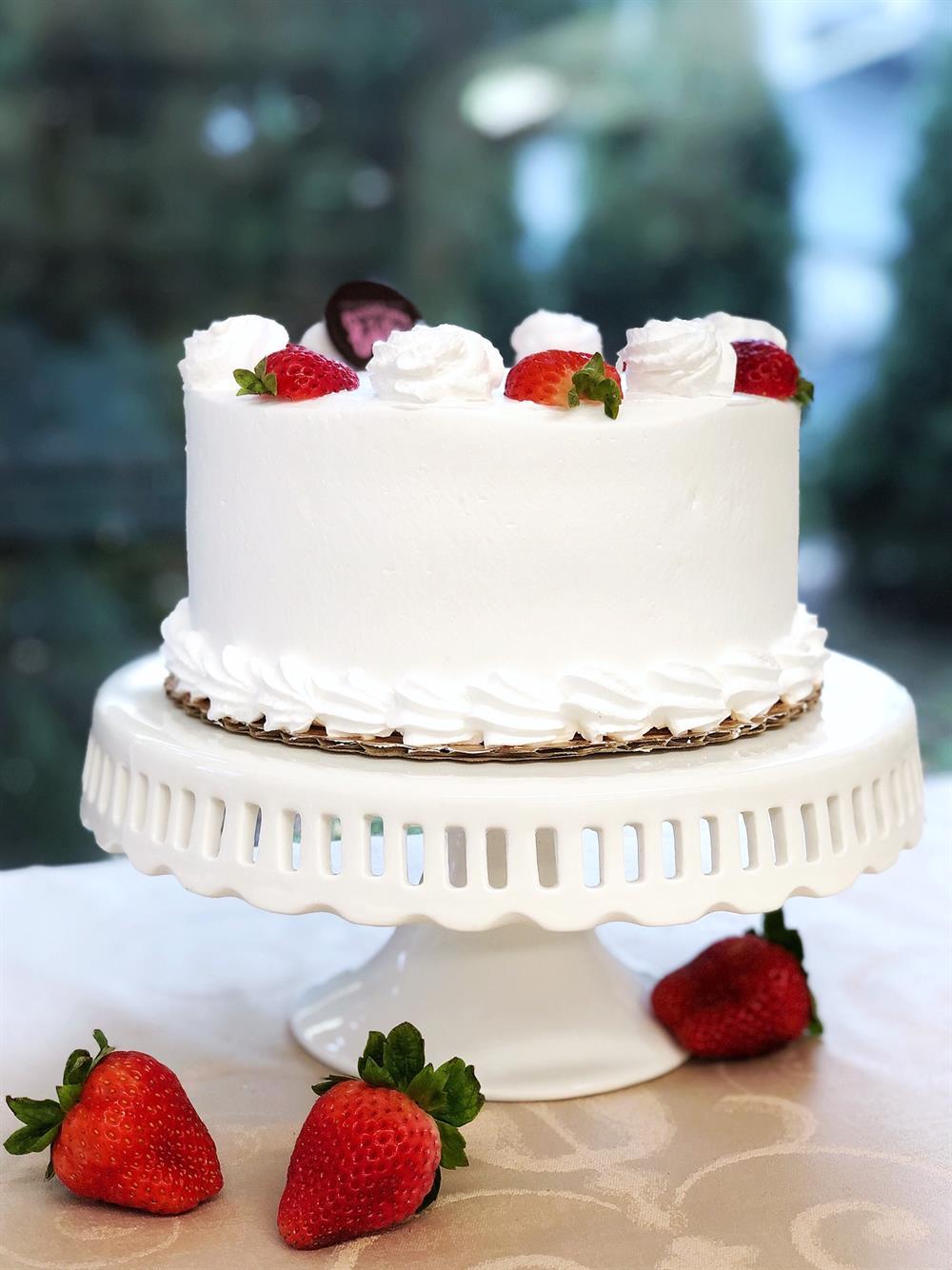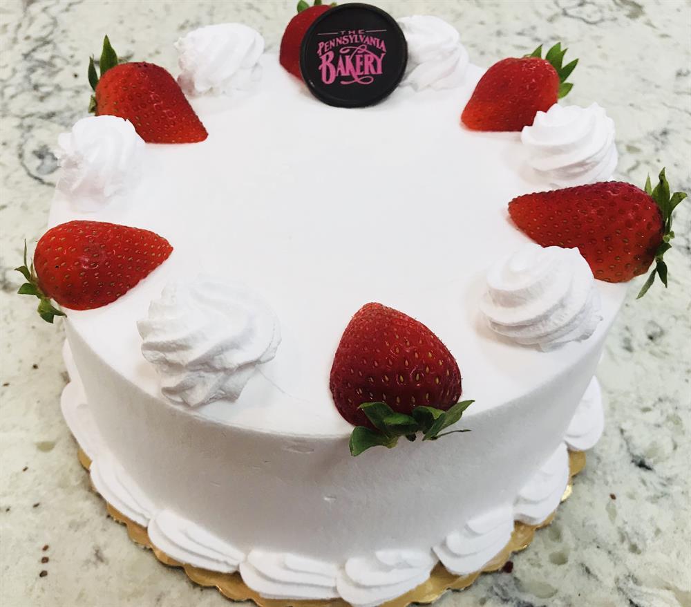 The Pennsylvania Bakery's Signature Famous Cake! Thick layers of yellow cake, with fresh strawberry filling and creamy vanilla custard between the layers. Iced in whipped cream and topped with strawberries. Serves 6-8.
