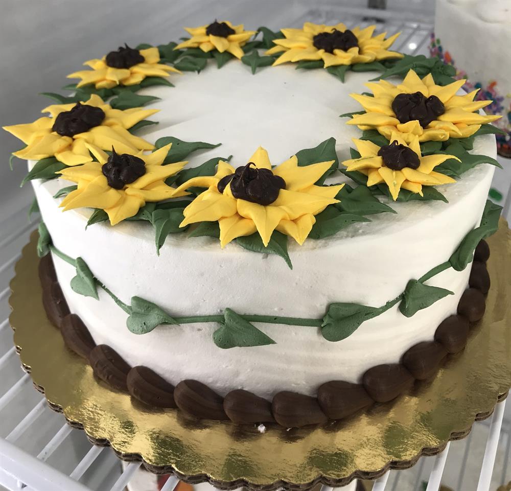 A 7 inch cake, buttercream filled, and hand-decorated with a ring of hand-decorated sunflowers. Serves 6-8. When ordering, please specify cake flavor - including: yellow, chocolate, 1/2 and 1/2 (layer of yellow and layer of chocolate), or Marble.