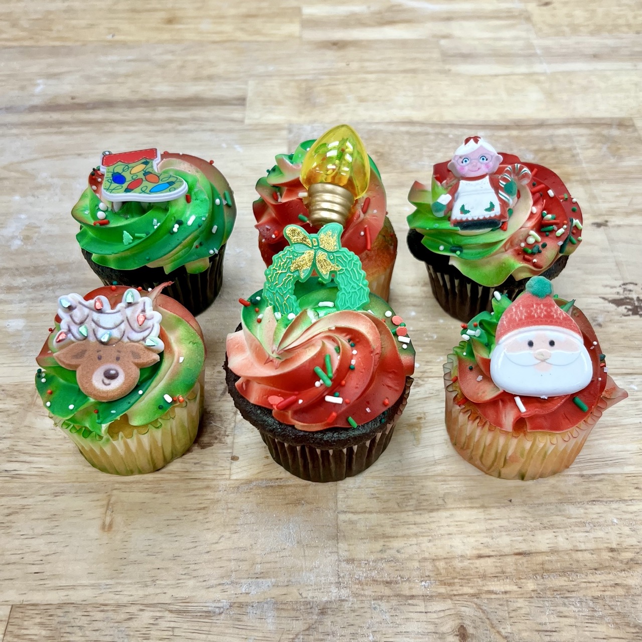 A half dozen of our Christmas Swirl cupcakes (3 chocolate and 3 yellow), each topped with a swirl of buttercream and a holiday pick/ring.