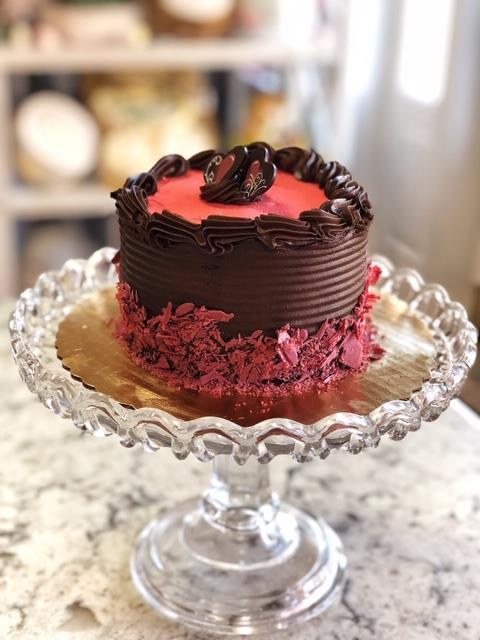 A small 4 inch version of our larger chocolate hurricane torte, perfect for a couple's Valentine's celebration. Layers of chocolate cake with chocolate fudge filling and icing and garnished with red chocolate garnish on top. Serves 2-4.