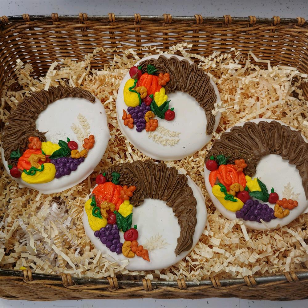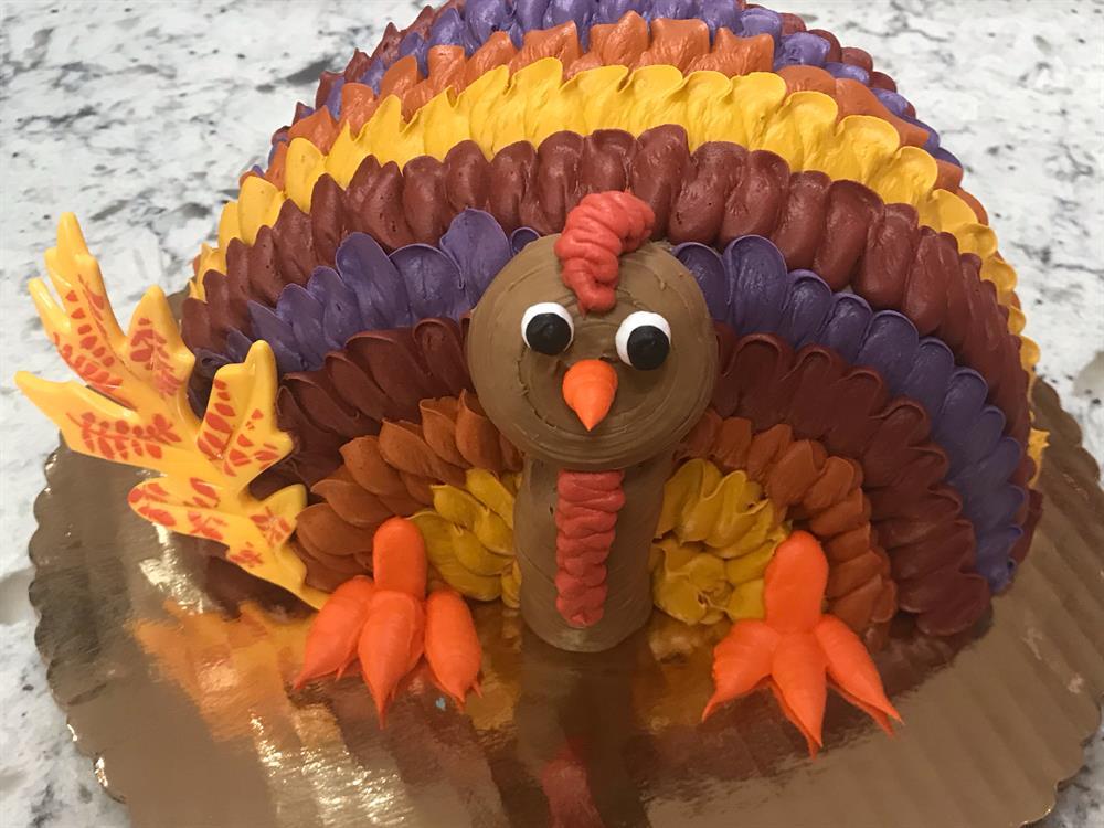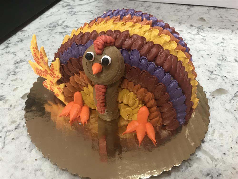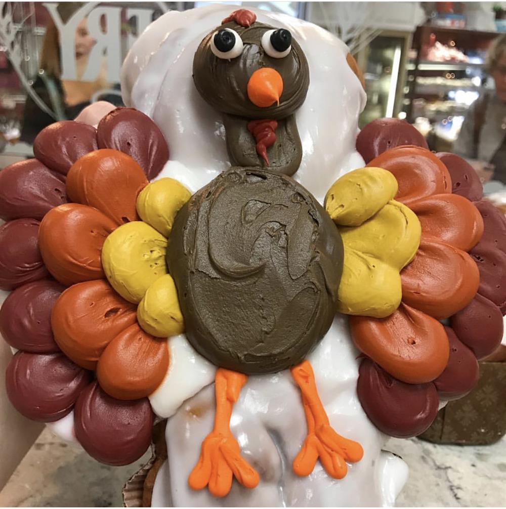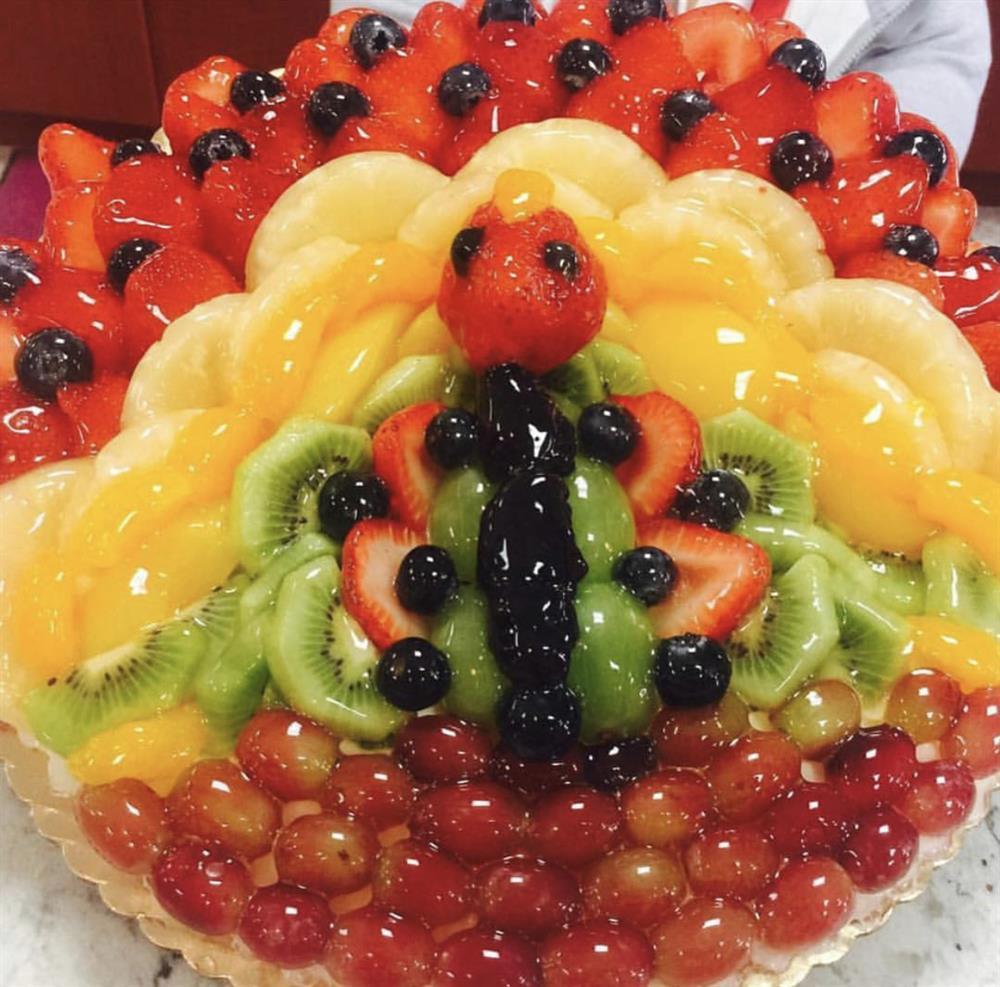 Our signature buttery tart shell, filled with our creamy French custard, and topped with arranged fresh fruit to look like a Thanksgiving Turkey, and finished off with an apricot glaze to give it a beautiful shine. Serves 8+.