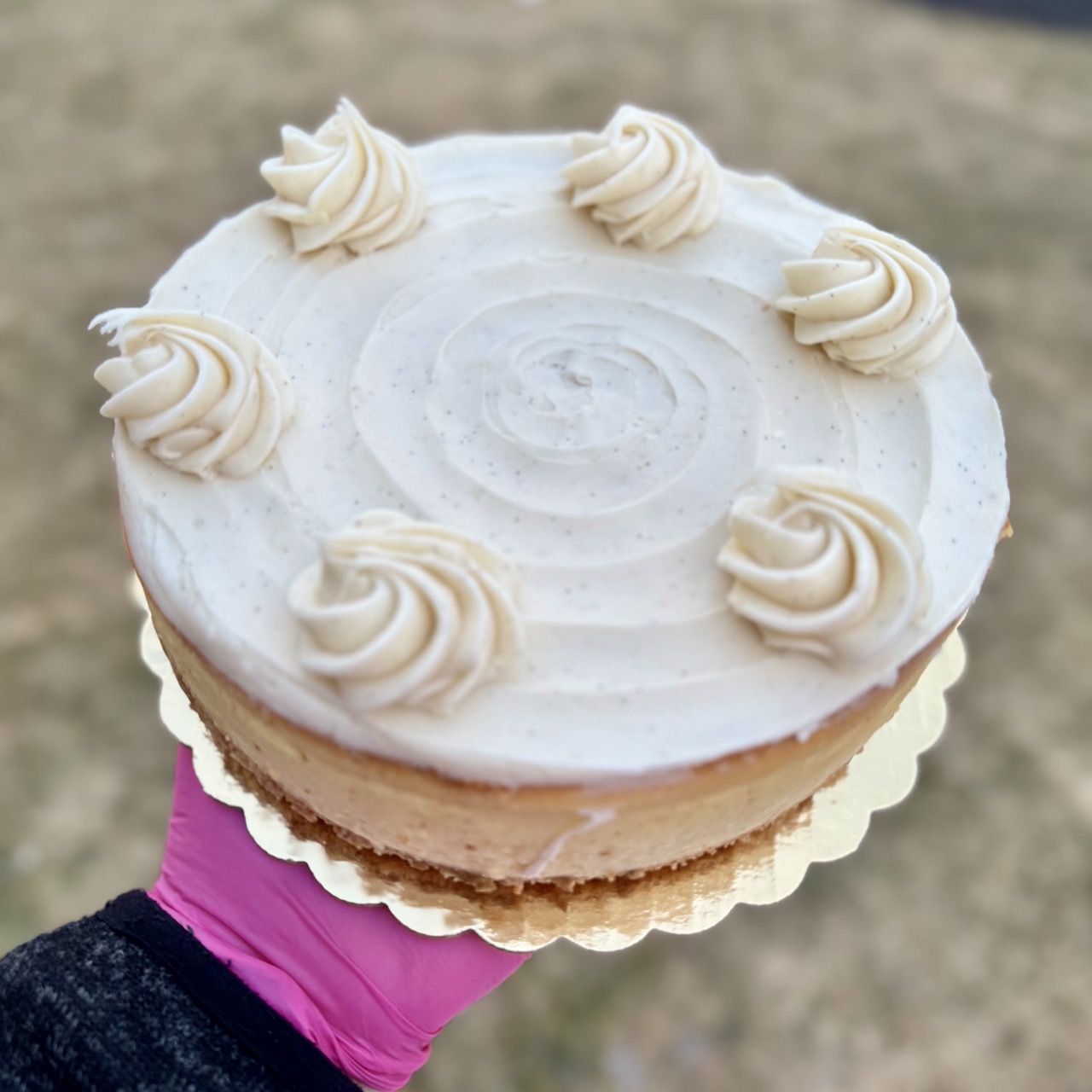Our traditional New York Style Cheesecake with vanilla bean puree mixed in. Topped with white chocoalte mousse.