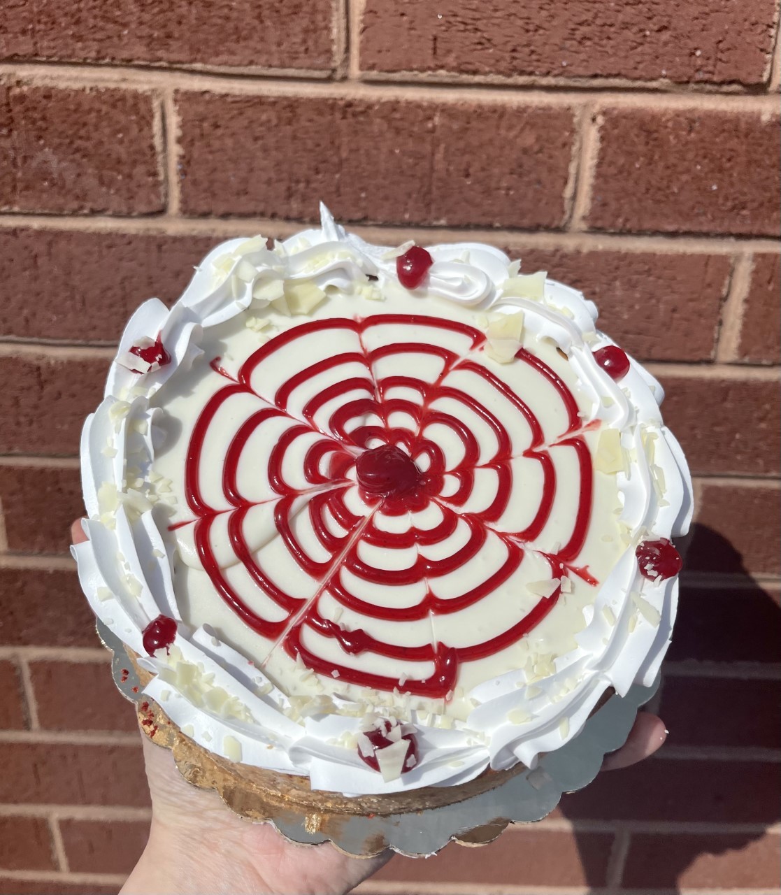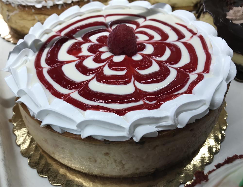 Our creamy New York style cheesecake flavored with raspberry and topped with fresh raspberry filling, whipped cream, and white chocolate shavings.